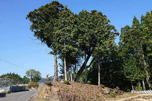 「胡麻田」入口の坂道を登り切った所に大きくそびえる桐の木。5月の満開時が美しい。